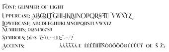 เซริฟที่สง่างามและการตกแต่งที่อ่อนโยนของ Glimmer Of Light นำความรู้สึกของความเบาไปยังโครงการออกแบบใด ๆ โดยเฉพาะอย่างยิ่งเหมาะสำหรับการสร้างแบรนด์ผลิตภัณฑ์ความงาม บรรจุภัณฑ์ของร้านบูติก หรือเครื่องเขียนที่ทำตามสั่ง ฟอนต์นี้มีทางเลือกทางสไตล์ที่กระตุ้นให้เกิดการทดลองสร้างสรรค์ เพิ่มความดราม่าหรือประกายให้กับการออกแบบ โดยรวมแล้ว Glimmer Of Light โดดเด่นเป็นฟอนต์ที่หลากหลายซึ่งผสมผสานความสง่างามแบบคลาสสิกเข้ากับรายละเอียดที่จินตนาการ ทำให้เป็นส่วนเสริมที่มีค่าในเครื่องมือของนักออกแบบทุกคน